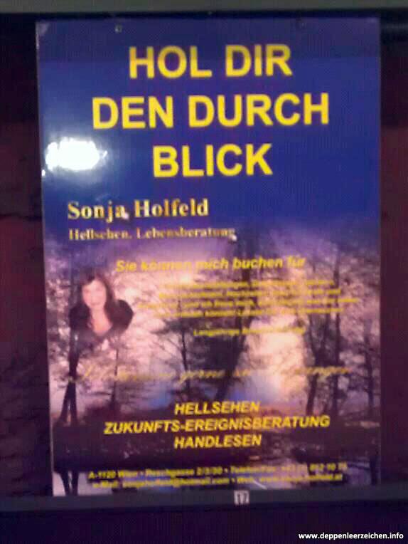 Fundort auf der Karte anzeigenBei der Hellseherin Sonja Holfeld aus Wien, die auch schon im TV dabei half, die Menschen um viel Geld zu erleichtern, gibt es “Den Durch Blick”.